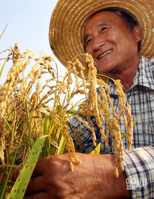 수확의 계절인 가을이 왔다. 25일 경기 고양에 위치한 논에서 한 농부가 누렇게 익은 벼를 바라보며 수확의 기쁨에 흠뻑 잠겨있다.