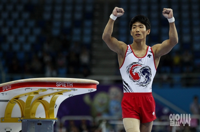 양학선이 25일 인천 남동체육관에서 열린 2014 인천 아시안게임 남자체조 뜀틀 결승에서 도마 연기를 마친 뒤 두 주먹을 불끈 쥐고 있다.
