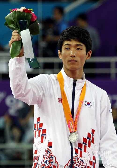 25일 인천 남동체육관에서 열린 2014 인천 아시안게임 남자체조 뜀틀 결승 시상식에서 은메달을 획득한 양학선이 관중을 향해 손을 들어 인사하고 있다.