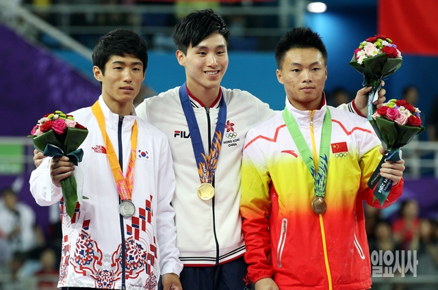 25일 인천 남동체육관에서 열린 2014 인천 아시안게임 남자체조 뜀틀 결승 시상식에서 은메달을 획득한 양학선(맨 왼쪽)이 기념촬영을 하고 있다. 금메달은 홍콩의 셱 와이헝(가운데), 동메달은 중국의 후앙 시.