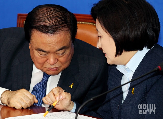 26일 서울 여의도 국회에서 열린 새정치민주연합 비상대책위원회의에서 문희상 비대위원장(왼쪽)과 박영선 원내대표가 대화하고 있다.