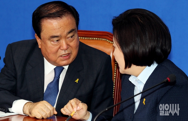 26일 서울 여의도 국회에서 열린 새정치민주연합 비상대책위원회의에서 문희상 비대위원장(왼쪽)과 박영선 원내대표가 대화하고 있다.