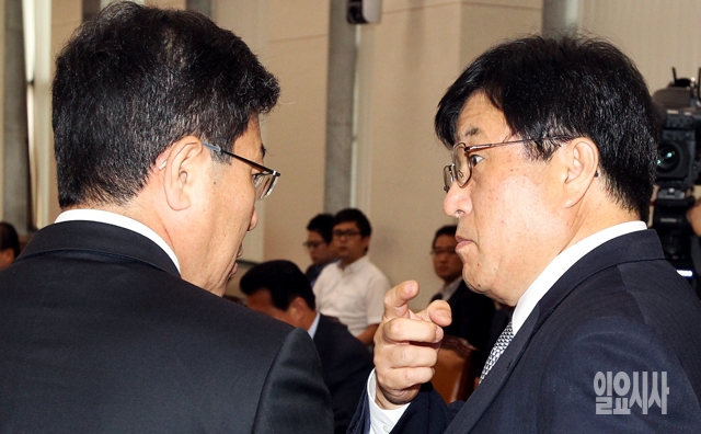 윤상직 산업통상자원부 장관(왼쪽)이 26일 서울 여의도 국회에서 열린 산업통상자원위원회 전체회의에서 이진복 여당 간사와 대화하고 있다.