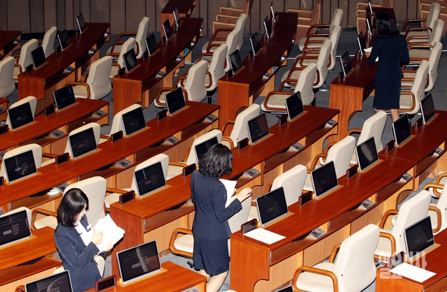 26일 서울 여의도 국회에서 열린 본회의에서 야당 의원들의 자리가 비어 있다.