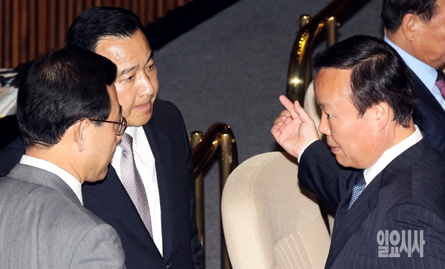26일 서울 여의도 국회에서 열린 본회의에서 이완구 새누리당 원내대표(가운데)와 주호영 정책위의장(왼쪽), 김재원 원내수석부대표가 대화하고 있다.