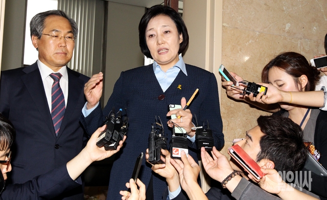 새정치민주연합 박영선 원내대표가 26일 서울 여의도 국회 운영위원장실에서 새누리당 이완구 원내대표와 비공개 회동을 마치고 취재진의 질문에 답하고 있다.