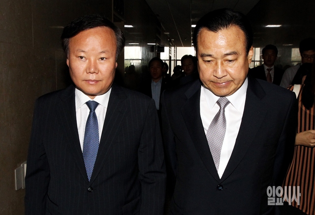 새누리당 이완구 원대대표(오른쪽)와 김재원 원내수석부대표가 26일 서울 여의도 국회에서 열린 운영위원회 전체회의를 마친 뒤 의총장으로 이동하고 있다.