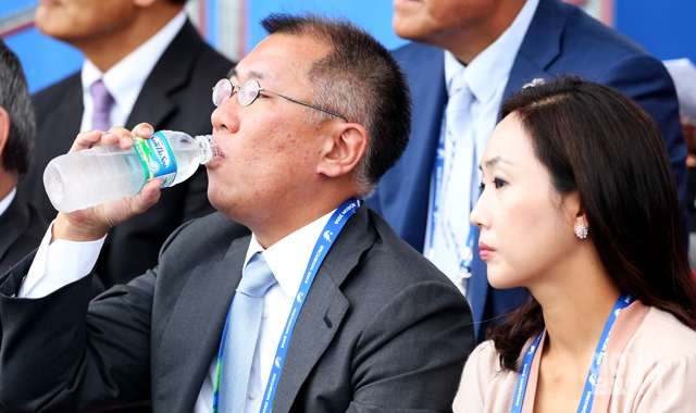 정의선 대한양궁협회 회장이 28일 인천 계양아시아드양궁장에서 열린 2014 인천 아시안게임 양궁 리커브 남·녀 단체 결승전을 관람하며 물을 마시고 있다. 오른쪽은 부인 정지선씨.