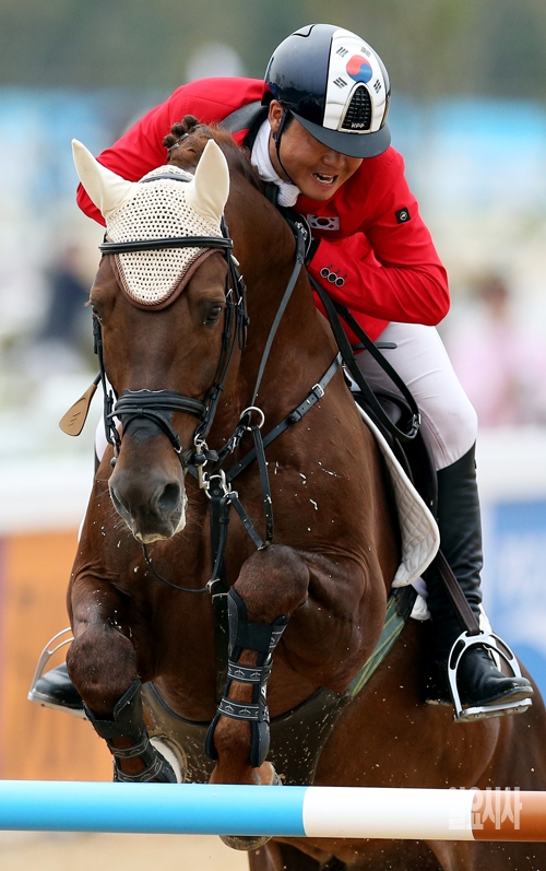 오성환이 28일 인천 드림파크 승마장에서 열린 2014 인천 아시안게임 승마 장애물 개인전 2차 예선 경기에서 장애물을 뛰어넘고 있다.