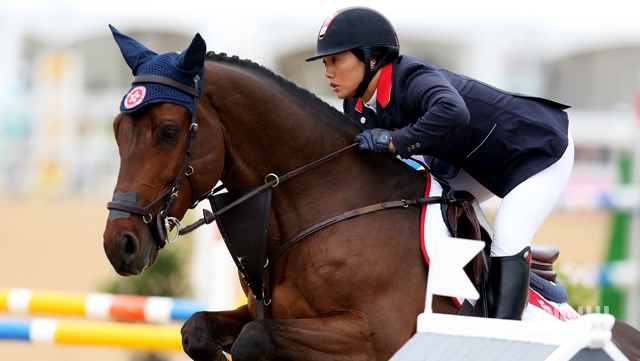 28일 인천 드림파크 승마장에서 열린 2014 인천 아시안게임 승마 장애물 개인전 2차 예선 경기에서 홍콩 선수가 장애물을 뛰어넘고 있다.