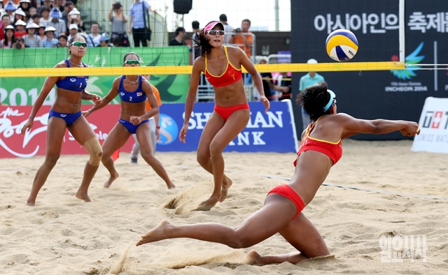 28일 인천 송도글로벌대학비치발리볼경기장에서 열린 비치발리볼 여자 결승전에서 중국(빨간색)과 태국이 접전을 벌이고 있다.