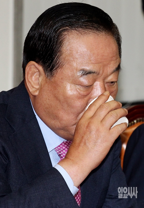 서청원 새누리당 최고위원이 29일 서울 여의도 국회에서 열린 최고위원회의에서 물을 마시고 있다.