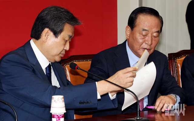김무성 새누리당 대표(왼쪽)가 29일 서울 여의도 국회에서 열린 최고위원회의에서 서청원 최고위원에게 메모지를 건네고 있다.
