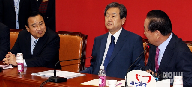 서청원 새누리당 최고위원(맨 오른쪽)이 29일 서울 여의도 국회에서 열린 최고위원회의에서 이완구 원내대표에게 야당 원내대표와 만날 것을 제안을 하고 있다.