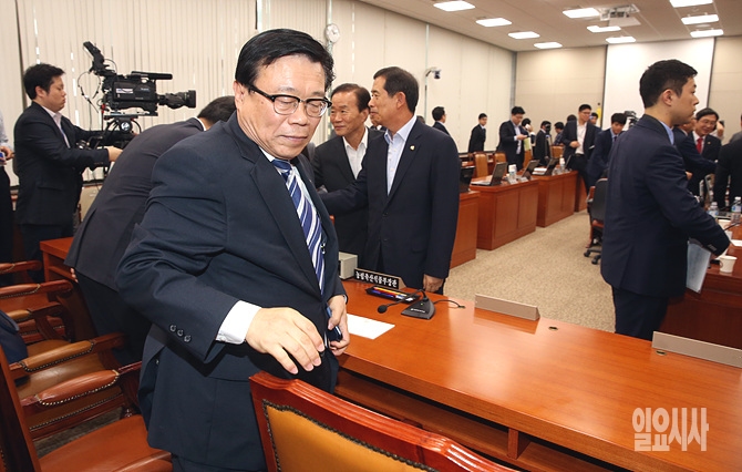 29일 오전, 농림축산식품해양수산위원회 전체회의가 서울 여의도 국회 농림위 회의실에서 열린 가운데, 김우남 위원장이 여야 원내대표 회담 결과를 본 후 진행하자며 산회하자 이동필 농림부장관이 자리에서 일어나고 있다.