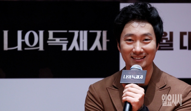 29일 서울 롯데시네마 건대입구점에서 열린 영화 '나의 독재자'(감독 이해준) 제작보고회에서 배우 박해일이 취재진의 질문에 답하고 있다.