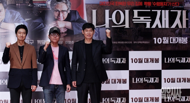 29일 서울 롯데시네마 건대입구점에서 열린 영화 '나의 독재자' 제작보고회에서 박해일(왼쪽부터), 감독 이해준, 설경구가 파이팅을 외치고 있다.
