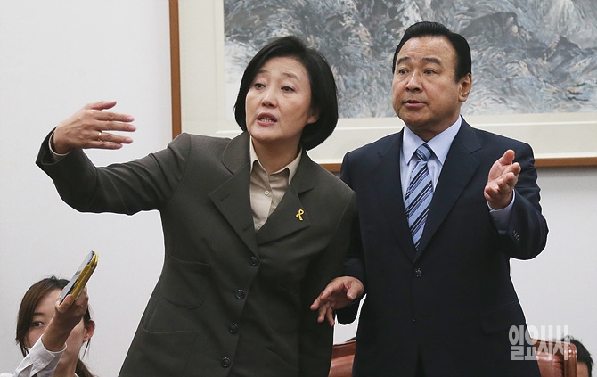 29일 오전, 새누리당 이완구 원내대표(사진 오른쪽)와 박영선 새정치민주연합 원내대표가 서울 여의도 국회 운영위원장실에서 여야 원내대표 회담 직후, 취재진 앞에서 손짓을 하고 있다.