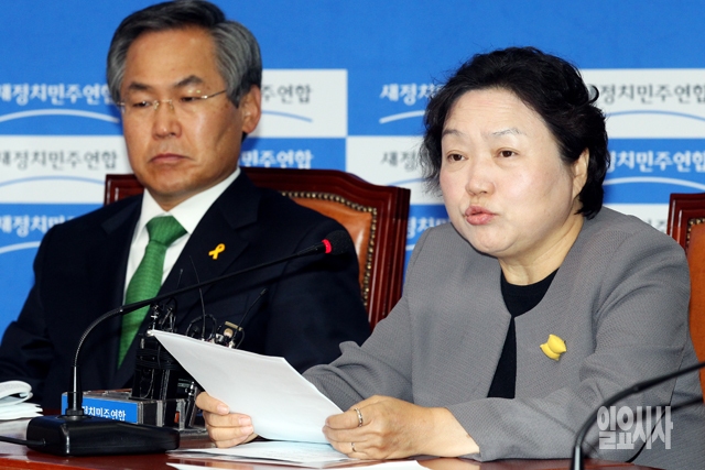 새정치민주연합 인재근 비대위원(오른쪽)이 20일 서울 여의도 국회에서 열린 비상대책위원회의에서 모두발언을 하고 있다.