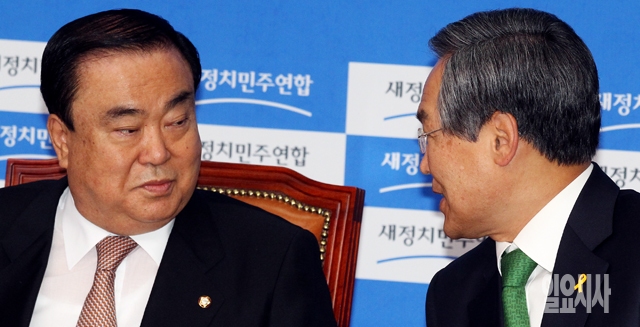 새정치민주연합 문희상 비대위원장(왼쪽)과 우윤근 원내대표가 20일 서울 여의도 국회에서 열린 비상대책위원회의에서 대화하고 있다.