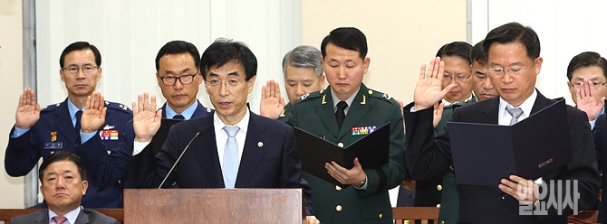 20일 오전, 이용걸 방위사업청장(사진 왼쪽에서 세 번째) 및 관계자들이 서울 여의도 국회에서 열린 국방위 국정감사에 증인으로 출석해 성실한 답변을 하겠다며 선서하고 있다.
