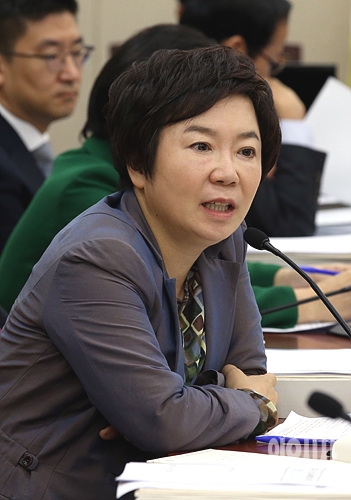 20일 오전, 이용걸 방위사업청장이 서울 여의도 국회에서 열린 국방위 국정감사에 증인으로 출석한 가운데, 새누리당 정미경 의원이 질의하고 있다.