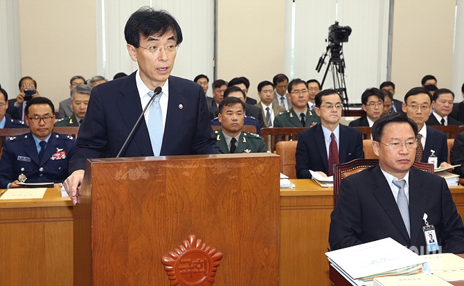 20일 오전, 이용걸 방위사업청장이 서울 여의도 국회에서 열린 국방위 국정감사 직전, 인사말을 하고 있다.
