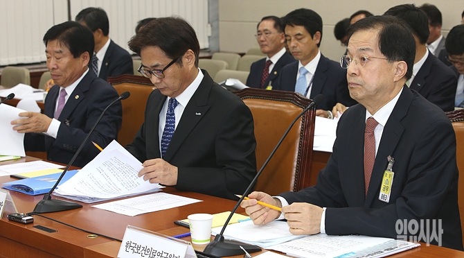 20일 오전, 원희목 한국보건의료연구원장이 서울 여의도 국회에서 열린 보건복지위 국정감사에 증인으로 출석해 의원들의 질의를 듣고 있다.
