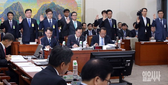 20일 서울 여의도 국회에서 열린 정무위원회의 국정감사에 출석한 증인들이 선서를 하고 있다. 왼쪽 두번째부터 도성환 홈플러스 사장, 최태경 한성자동차 전무, 이원준 롯데쇼핑 사장, 장봉섭 현대아산 건설본부장, 이갑수 이마트 영업총괄 대표이사, 장민상 농심 부사장.