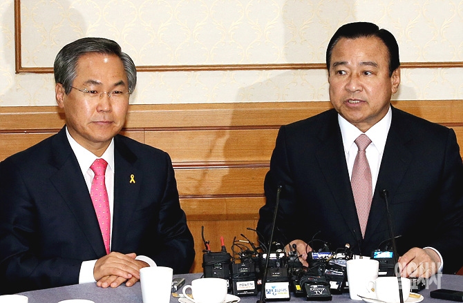 21일, 서울 여의도 국회에서 새누리당 이완구(사진 오른쪽)·새정치민주연합 우윤근 여야 원내대표 및 김재원·안규백 원내수석부대표가 회동을 갖고 있는 가운데, 이 원내대표가 발언하고 있다.