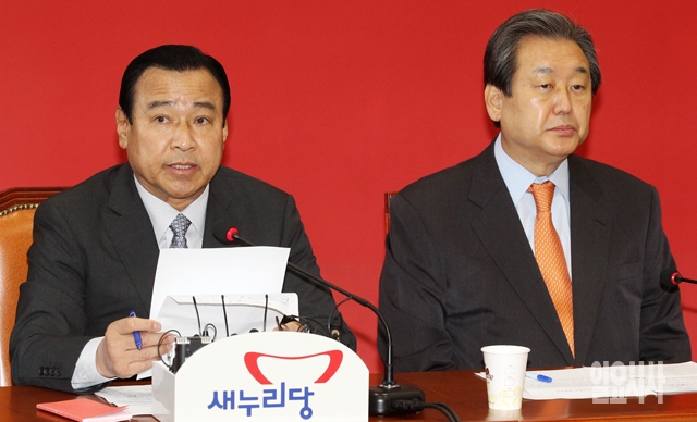 이완구 새누리당 원내대표(왼쪽)가 22일 서울 여의도 국회에서 열린 최고중진연석회의에서 모두발언을 하고 있다.