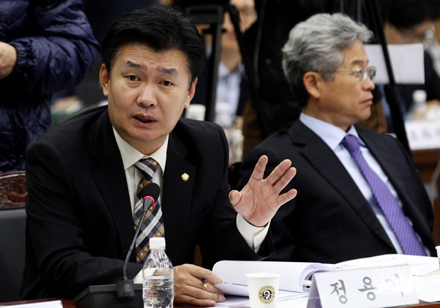 새누리당 정용기 의원이 22일 경기도 수원 경기도청에서 열린 국회 안전행정위원회의 국정감사에서 남경필 도지사에게 질의를 하고 있다.