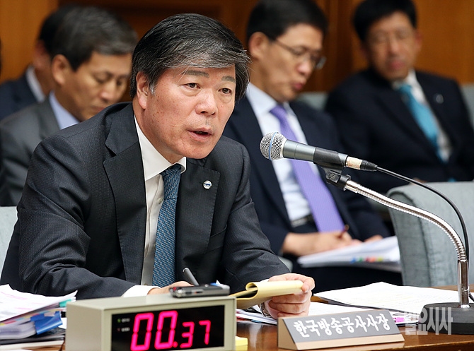 22일 오후, 서울 여의도 미래창조과학방송통신위원회 회의실에서 열린 KBS 등에 대한 국정감사에서 이날 증인으로 출석한 조대현 KBS 사장이 의원들의 질의에 답변하고 있다.