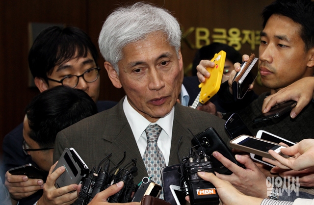김영진 KB금융지주 회장추천위원회 위원장이 22일 서울 중구 명동 KB금융지주 본점에서 윤종규 전 KB금융 부사장을 최종 회장 후보로 선정한 뒤 취재진의 질문에 답하고 있다.