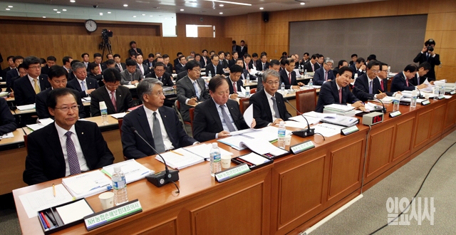 최원병 농업협동조합중앙회장을 비롯한 참석자들이 23일 서울 서대문구 농협중앙회에서 열린 국회 농림축산식품해양수산위원회의 농협중앙회 등에 대한 국정감사에서 의원들의 질의를 경청하고 있다.