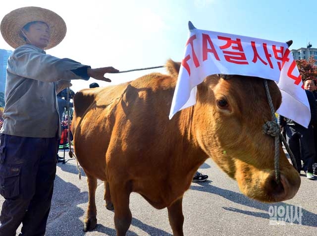 '영연방 FTA 국회비준 반대 전국 축산인 총 궐기대회'가 23일 서울 여의도공원에서 열린 가운데 한 참가자가 데리고 온 소가 'FTA 결사반대'라고 적힌 머리띠를 하고 있다.