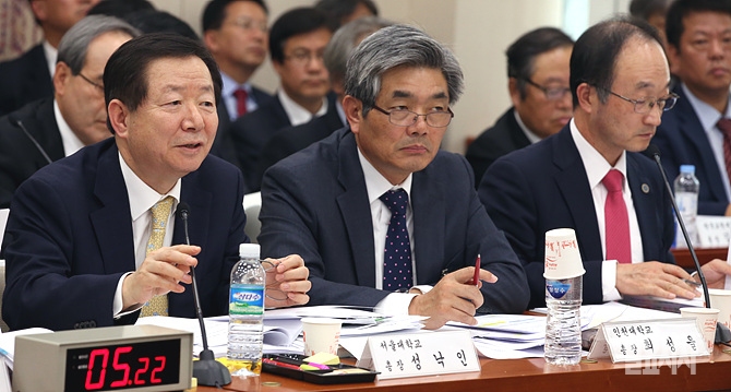 23일, 서울 여의도 국회 교육문화체육관광위원회 회의실에서 열린 국립대학 및 병원에 대한 국정감사에서 성낙인 서울대 총장이 의원들의 질의를 듣는 도중 잠시 웃음 짓고 있다.