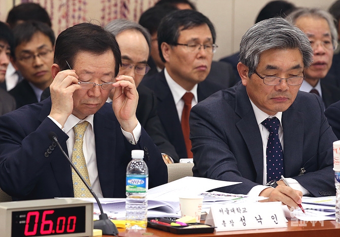 23일, 서울 여의도 국회 교육문화체육관광위원회 회의실에서 열린 국립대학 및 병원에 대한 국정감사에서 성낙인 서울대 총장이 답변자료를 보기 위해 안경을 쓰고 있다.