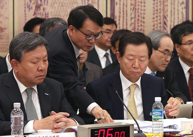 23일, 서울 여의도 국회 교육문화체육관광위원회 회의실에서 열린 국립대학 및 병원에 대한 국정감사 도중, 성낙인 서울대 총장이 관계자로부터 추가보고를 받고 있다.