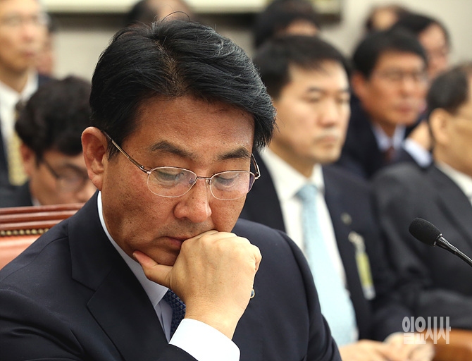 23일, 서울 여의도 국회 산업통상자원위원회 회의실에서 열린 한국가스공사 등에 대한 국정감사에서 장석효 한국가스공사 사장이 의원들의 질의를 듣던 도중, 잠시 고민에 빠져 있다.