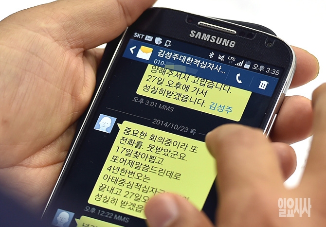 23일, 서울 여의도 국회 보건복지위원회 회의실에서 열린 대한적십자사 등에 대한 국정감사가 열린 가운데, 김춘진 위원장이 김성주 대한적십자사 총재로부터 온 문자메시지를 공개하고 있다.