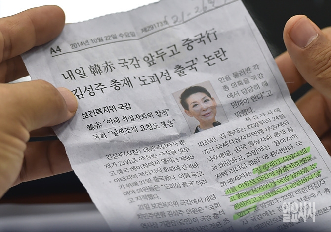23일, 서울 여의도 국회 보건복지위원회 회의실에서 열린 대한적십자사 등에 대한 국정감사가 열린 가운데, 김춘진 위원장이 김성주 대한적십자사 총재 국감 불출석 기사를 펼쳐보이고 있다.