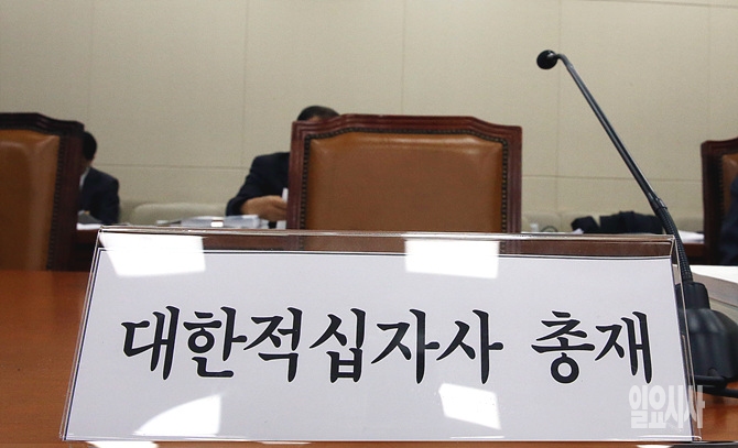 23일, 서울 여의도 국회 보건복지위원회 회의실에서 열린 대한적십자사 등에 대한 국정감사가 열린 가운데, 김성주 대한적십자사 총재 증인석이 비어 있다.