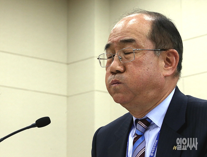 23일, 서울 여의도 국회 기획재정위원회 회의실에서 열린 은행들에 대한 국정감사 도중 이덕훈 한국수출입은행장이 잠시 눈을 감고 생각에 잠겨 있다.