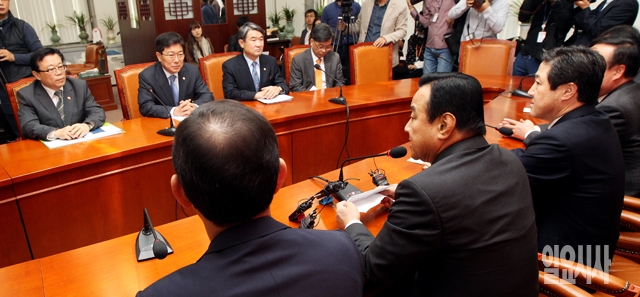 이완구 새누리당 원내대표을 비롯한 윤상직 산업통상부 장관과 이동필 농림축산식품부 장관, 조태용 외교부 1차관 등이 24일 서울 여의도 국회 원내대표실에서 한-호주 및 한-캐나다 FTA 비준동의안과 관련한 당정협의를 갖고 있다.