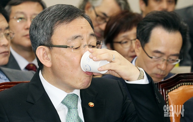 최성준 방통위원장이 24일 서울 여의도 국회에서 열린 미래창조과학방송통신위원회의 국정감사에서 물을 마시고 있다.
