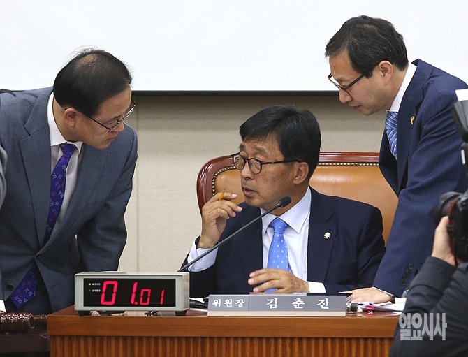 23일, 서울 여의도 국회에서 열린 보건복지위원회 회의실에서 국정감사가 열린 가운데, 증인으로 채택된 김성주 대한적십자사 총재 증인석 불참과 관련해 김춘진 위원장(사진 가운데), 이명수·김성주 여야 간사가 이야기를 나누고 있다.