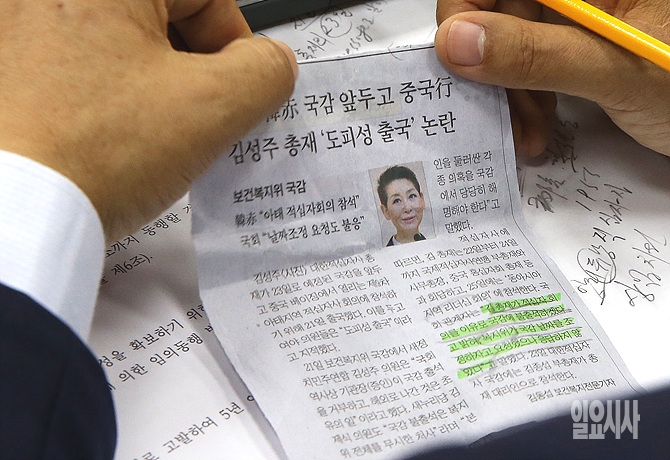 23일, 서울 여의도 국회 보건복지위원회 회의실에서 국정감사가 열린 가운데, 김춘진 위원장이 증인으로 채택됐지만 출석하지 않은 김성주 대한적십자사 총재에 대한 기사를 확인하고 있다.