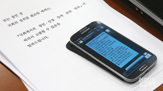 23일, 서울 여의도 국회 보건복지위원회 회의실에서 국정감사가 열린 가운데, 김춘진 위원장이 증인으로 채택된 김성주 대한적십자사 총재가 불참하자 출석을 촉구하는 내용의 문자메시지를 공개하고 있다.