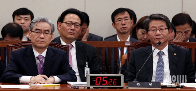 24일 서울 여의도 국회에서 열린 외교통일위원회의 국정감사에 참석한 류길재 통일부 장관(오른쪽)과 박찬봉 민주평화통일자문회의 사무처장이 의원들의 질의를 경청하고 있다.